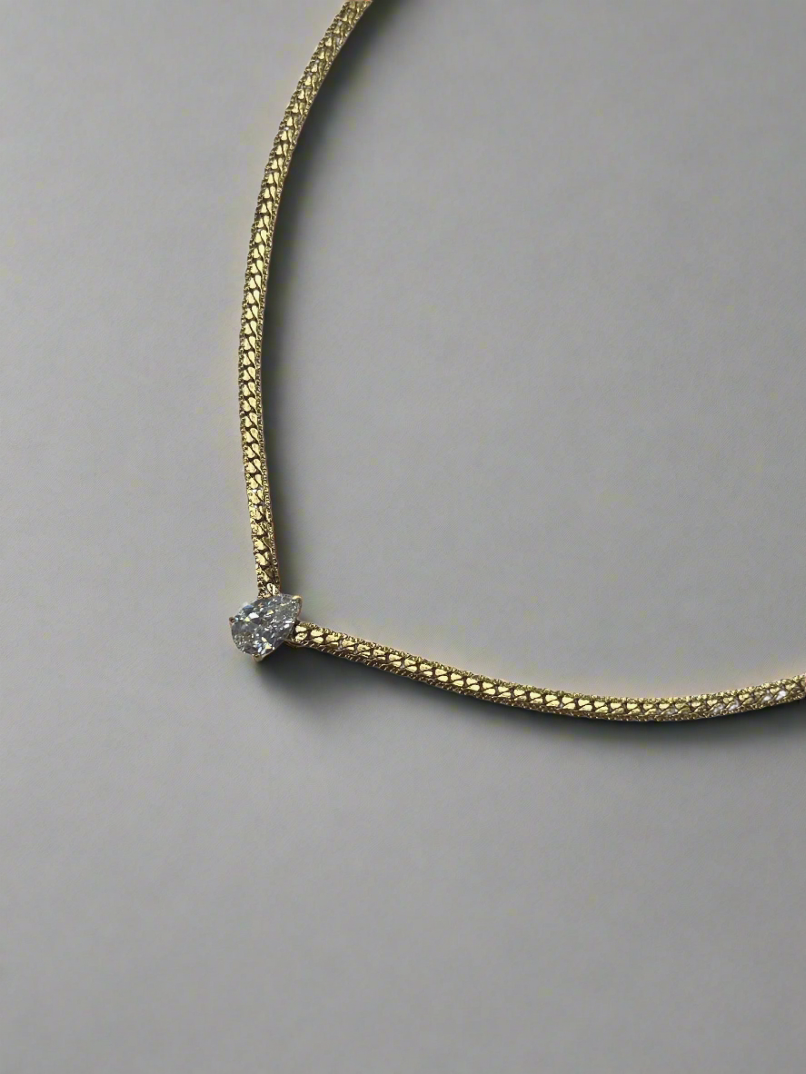 This gold chevron chain necklace - leveled up with a pear shaped cubic zirconia stone elevates even your most basic outfit. The Leveled Up Chevron Necklace is made of high quality stainless steel and is then gold plated.